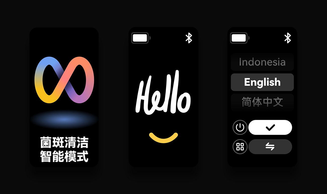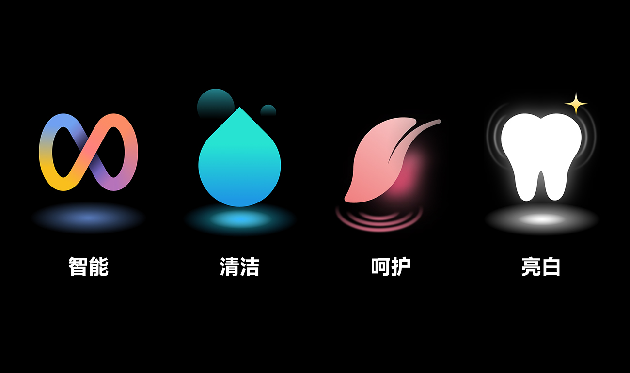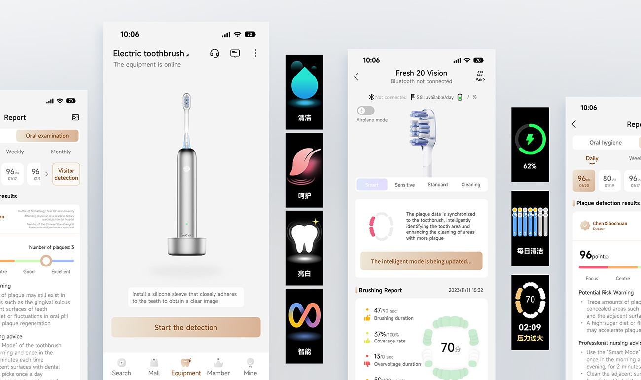 部分界面采用上下滑動的交互方式,采用同色系漸變塑造光影效果,底光向上打光照亮區域,即實用又美觀。按鈕采用相鄰色作為漸變主色,色度跨度小,不容易形成色差,適合在小屏幕上使用。同時,適當的加大界面字體,使用戶在使用牙刷時可以看的更加清晰。敏感模式放大信息區,牙齒的元素作為背景點綴出現不會喧賓奪主。界面采用同風格光線作分割線,合理分割不同信息板塊,采用柱狀圖來表達數據信息,柱狀圖采用相同漸變原理制作線性漸變,下方與背景色相互融合,讓色彩過渡更加自然和諧。整體以簡約大方為主,去除繁雜裝飾利于小屏展示,同時添加科技光線,賦予設計科技感。