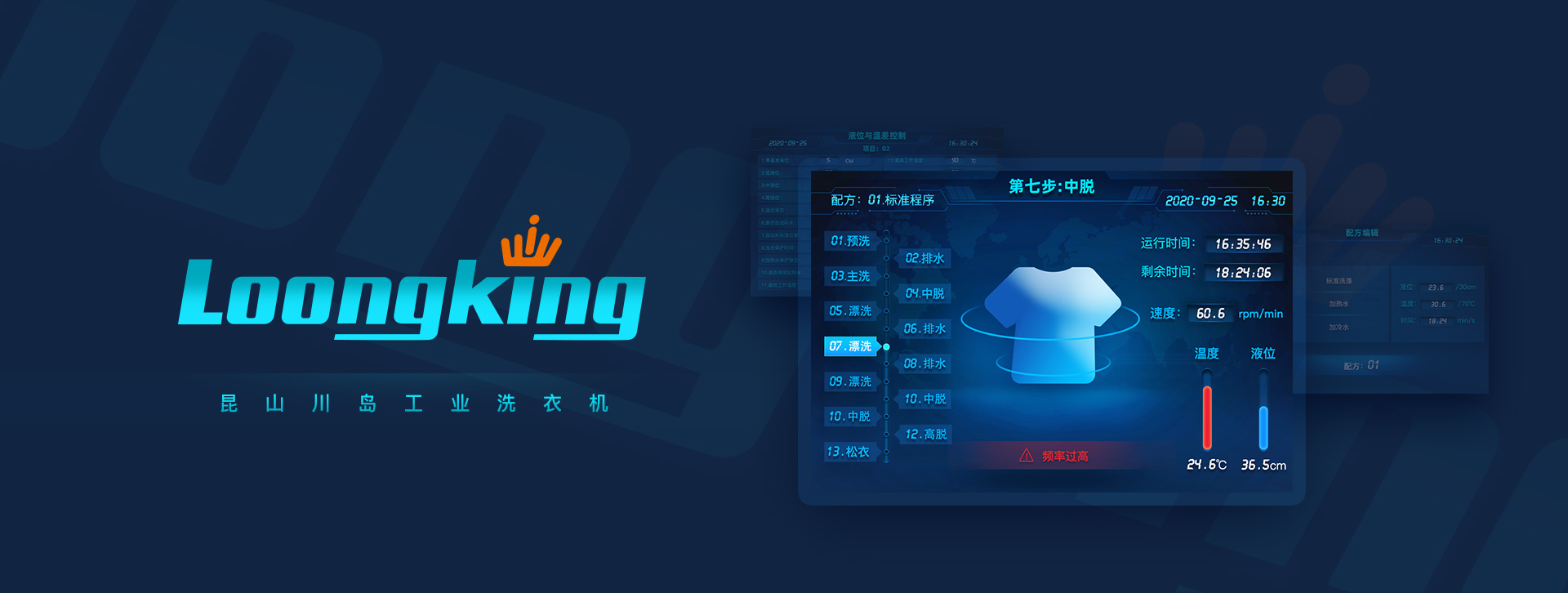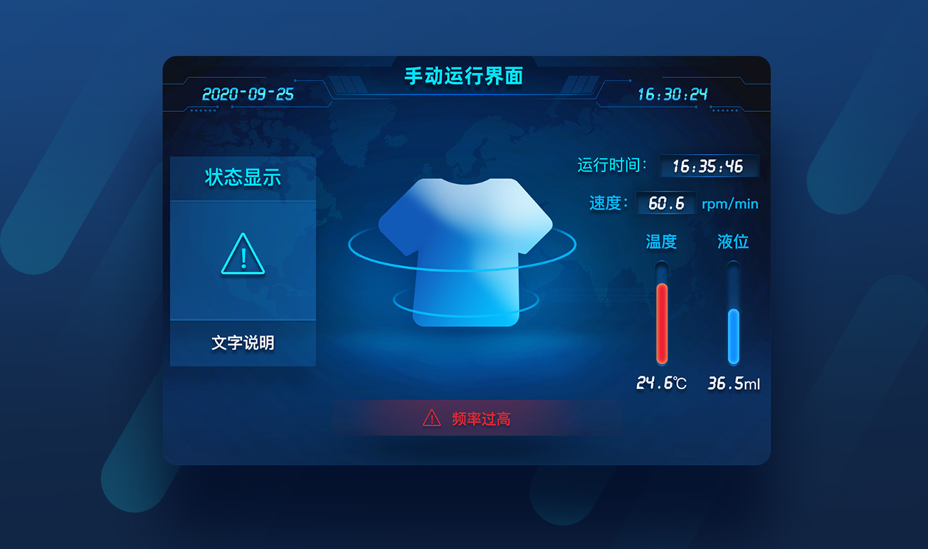 昆山工業(yè)洗衣機顯示屏與實體按鍵為一體,讓操作人員能夠更加直觀的將實體鍵與功能界面相連接,但會使屏幕占比較小,考慮到界面的可觀性,適當(dāng)?shù)恼{(diào)整界面字體大小和界面元素比例。同時要保證界面美觀,在此項目中采用科技風(fēng)設(shè)計,用科技線條構(gòu)建標(biāo)題背景,讓文字在放大的同時不會讓人感覺呆板。主體背景融合全球化概念營造品牌調(diào)性,半透明質(zhì)感作為文本底使文字更加突出,方便相關(guān)操作人員查看選擇。