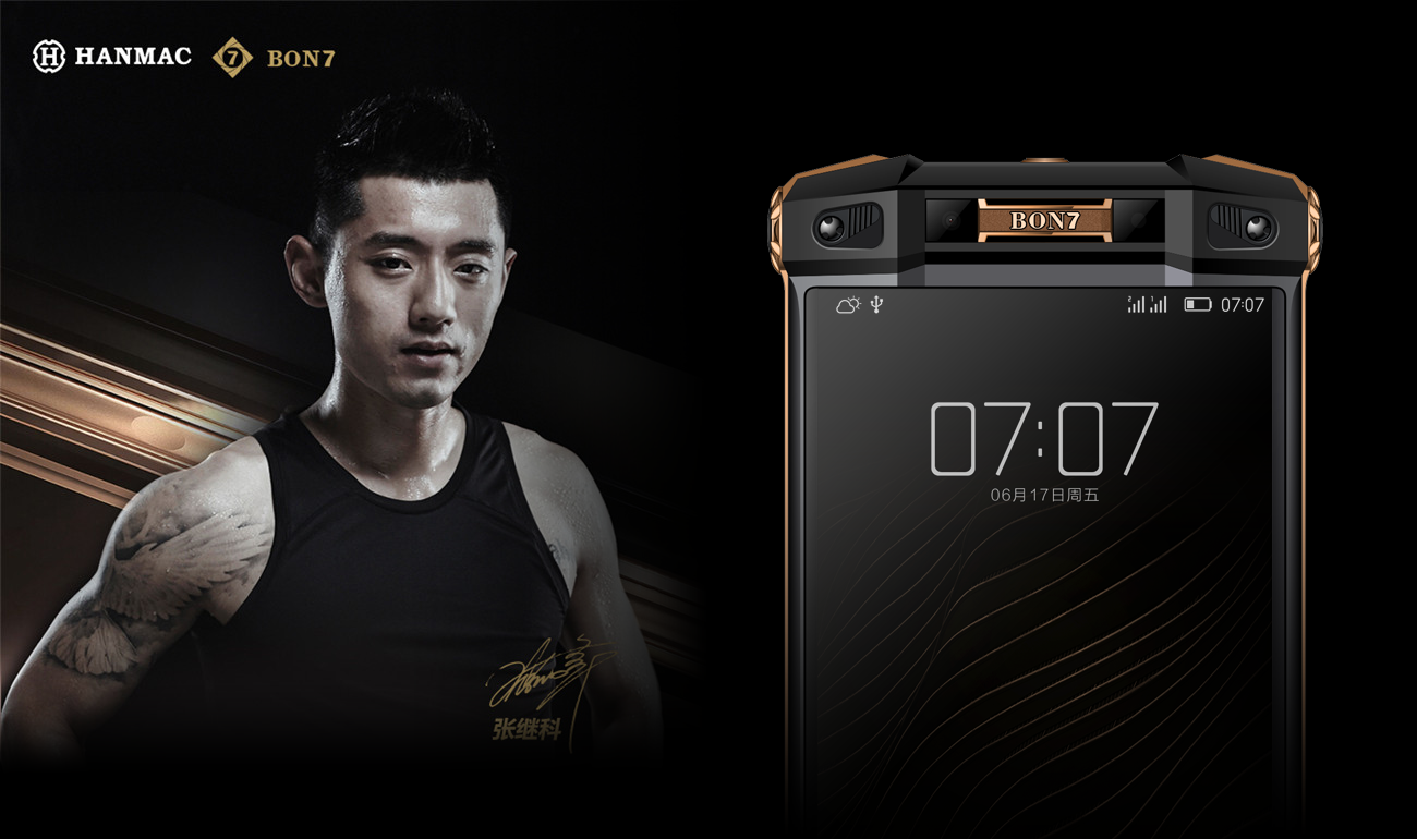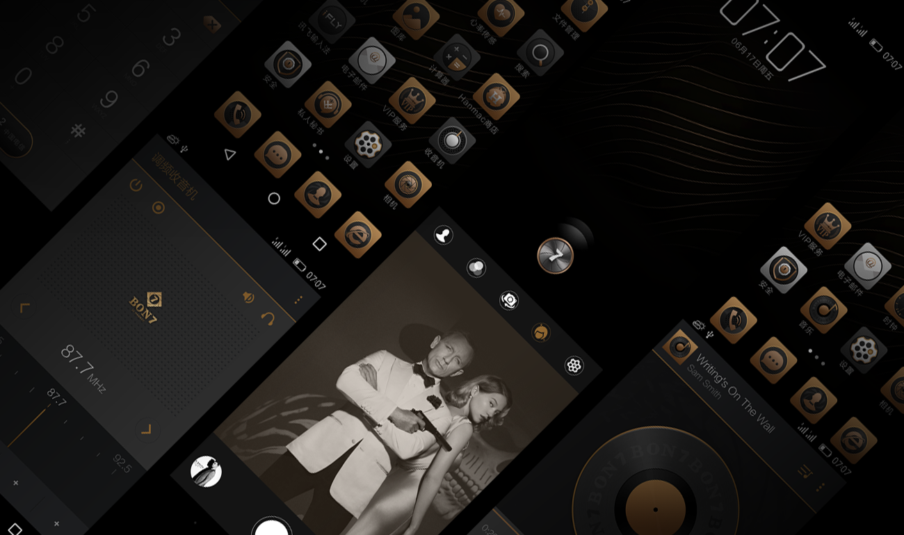2016年HANMAC與唯可可戰(zhàn)略合作為其 打造了一款輕奢機(jī)密Bon7手機(jī),唯可可將槍 元素和特工電影中的元素融入到手機(jī)UI中, 從新注入了獨(dú)特個性的品牌DNA設(shè)計語言。