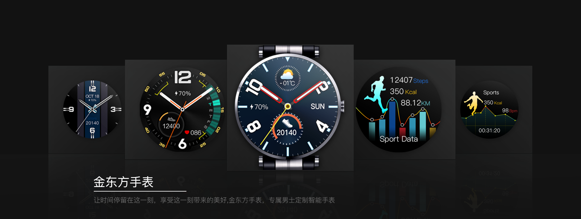 金東方智能手表為男士定制手表,手表主界面具有強(qiáng)烈的男士運(yùn)動(dòng)感。