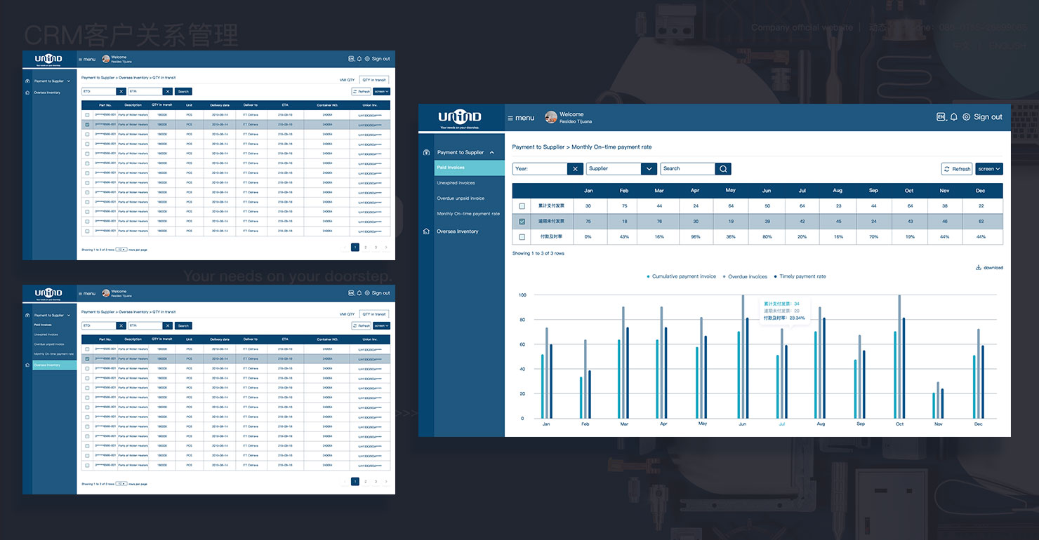 高級感、國際化是此次設(shè)計的標(biāo)準(zhǔn),按照客戶要求將平臺打造高端國際風(fēng)范。不同平臺的配色皆采用了金合聯(lián)供應(yīng)鏈技術(shù)有限公司的品牌形象,搭配活潑的暖色,使界面簡潔又不單調(diào)。按照標(biāo)準(zhǔn)化、統(tǒng)一化的原則對所有界面的UI元素進(jìn)行校準(zhǔn),使其形成一套標(biāo)準(zhǔn)的UI參考值。簡約設(shè)計更加突出平臺數(shù)據(jù),有利于目標(biāo)客戶對平臺的操作使用,保證了美觀與實用的平衡。