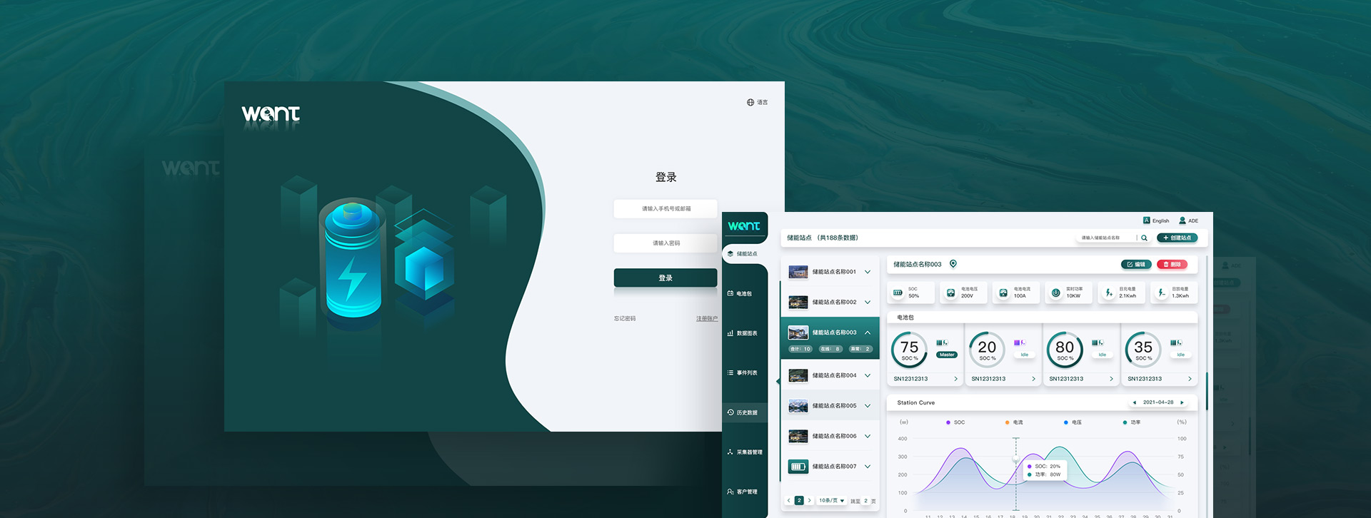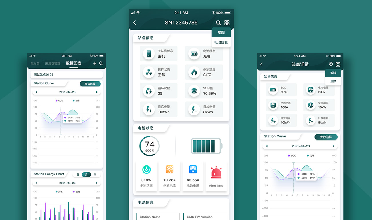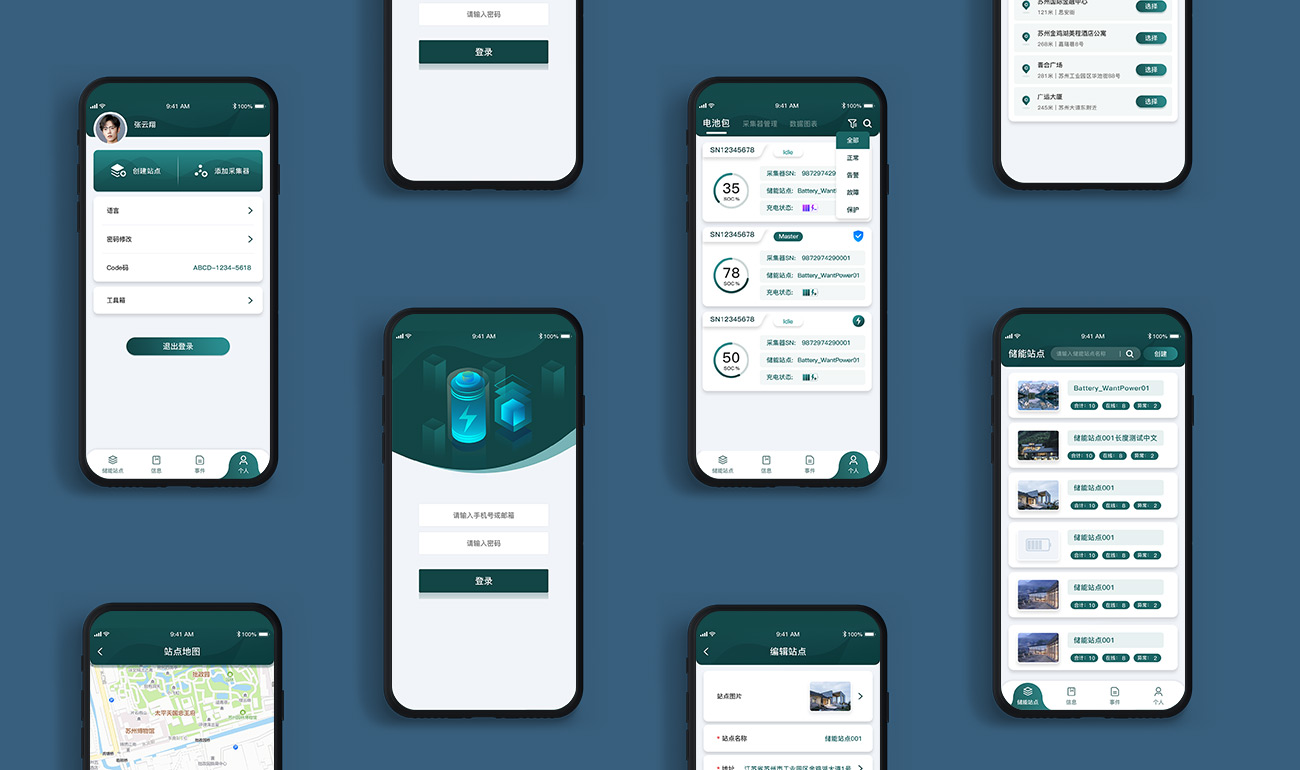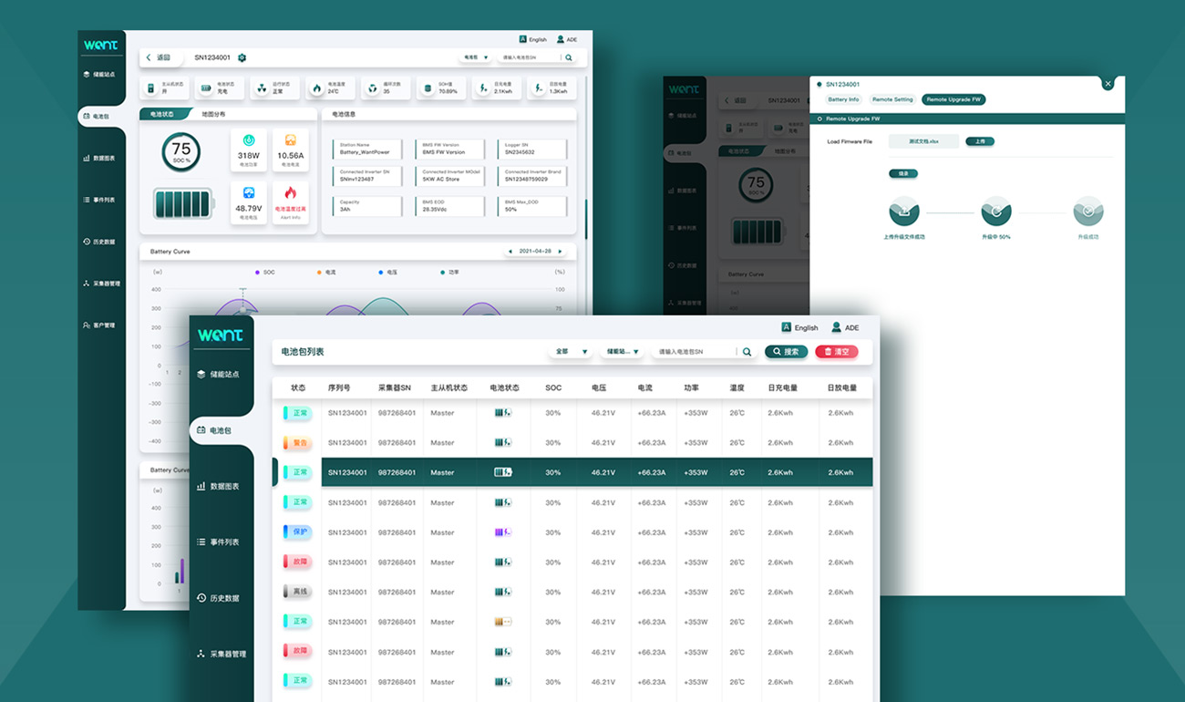 以沃克安特新能源技術有限公司的logo色為基礎,結合新能源行業的特殊屬性,選用偏藍的綠色為主顏色,使整體界面風格更加清新、自然,緊貼綠色新能源的特征。在UI設計時考慮用戶使用習慣,對UI交互進行合理梳理,不斷在細節處精細化,使界面更加柔和、穩定,讓用戶使用時更感到溫和、安心。龐大的文字信息以更加友好的可視化形式表現出來,提高用戶好感及使用效率。